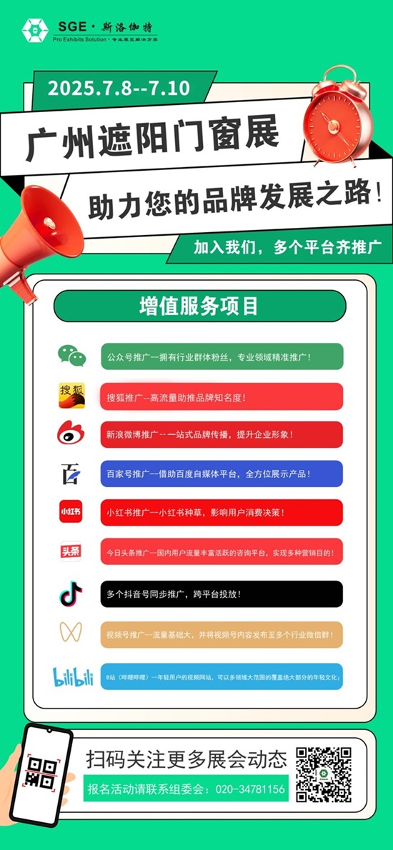 聚焦第15届广州遮阳门窗展,新品首发,以创新科技抢占市场先机;品牌亮相,借行业盛会提升市场影响力;渠道拓展,与优质采购商深度对话,构建稳固商业版图。展会同步举办高端论坛活动,对话权威,解读行业趋势,精准对接资源,为企业开拓市场注入强劲动能。